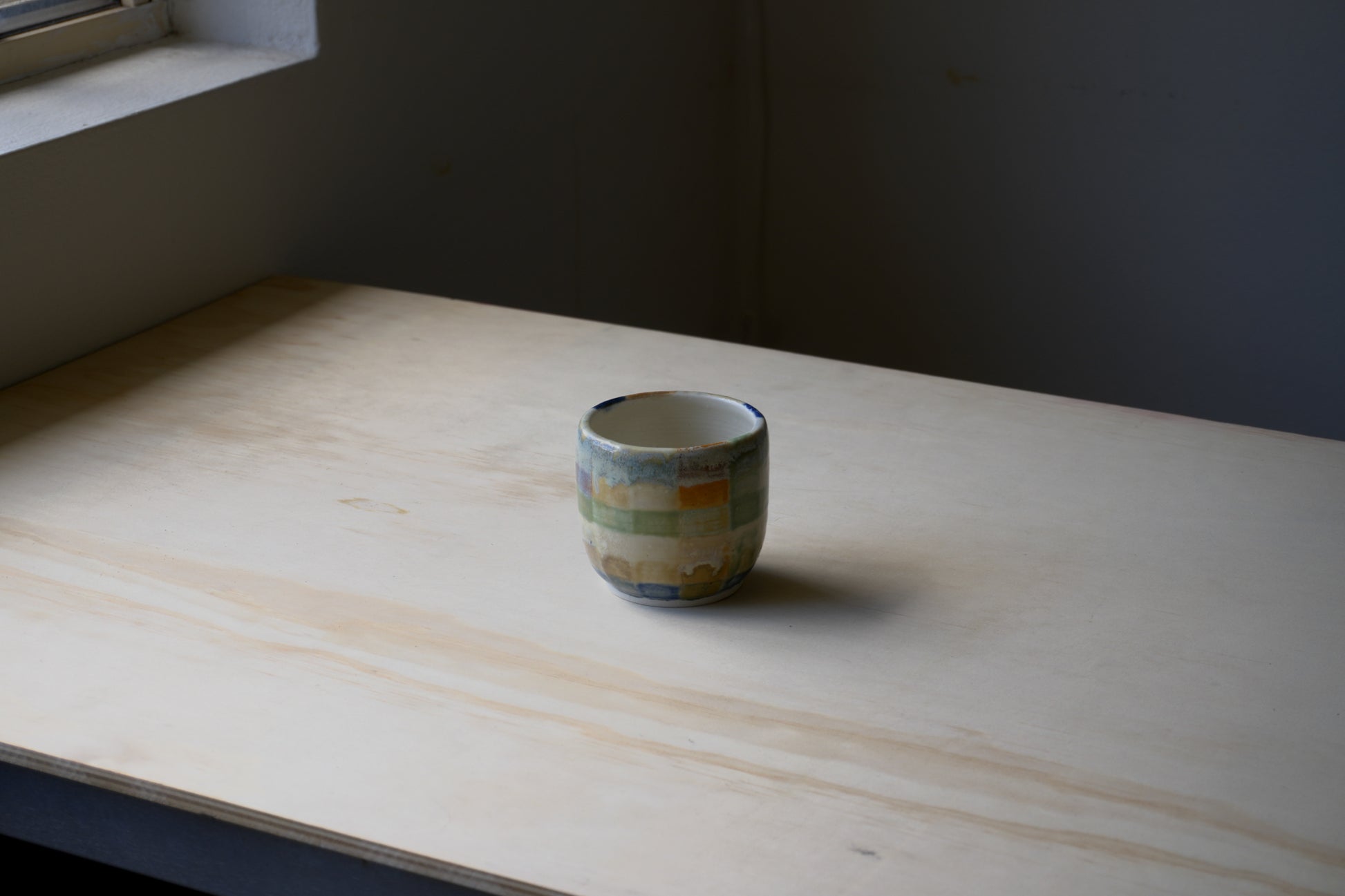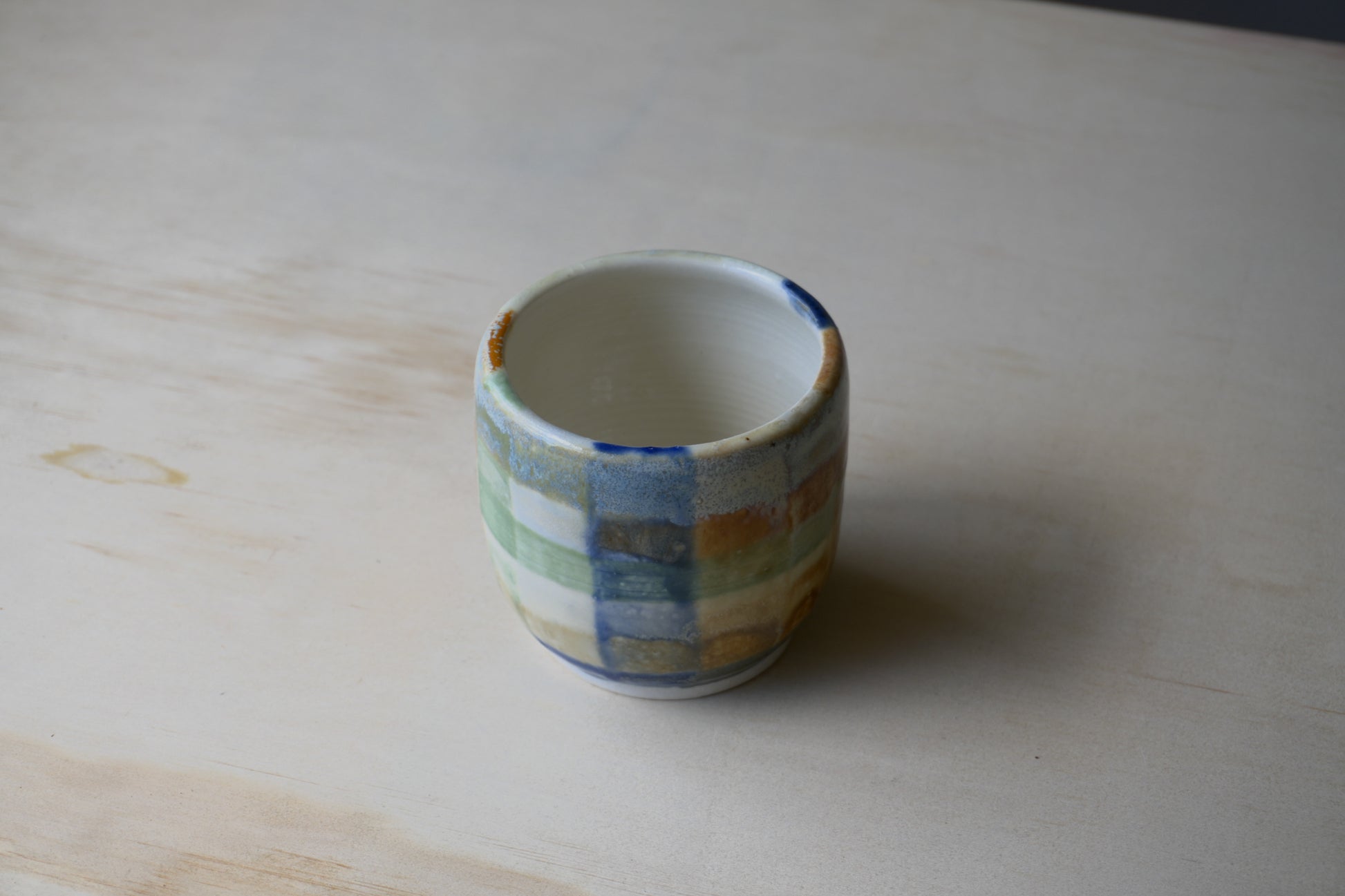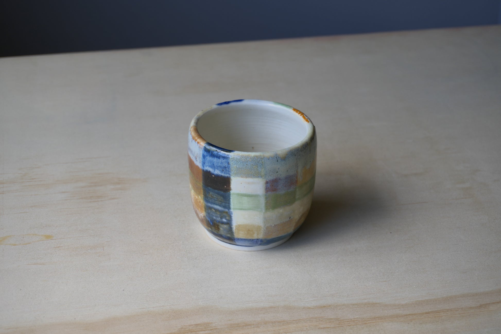 wheel-thrown grid cup. from test tile to cup - this design was born out of the desire to test all combinations of my glazes. an instant favourite and true reflection of play and process.